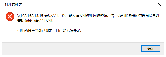 A和B电脑在同一局域网中,A电脑为Windows11系统,并且设置了只有administrator账户才能访问的共享文件夹,B电脑访问时,提示:引用的账户当前已锁定,且可能无法登录。(提示如下图)